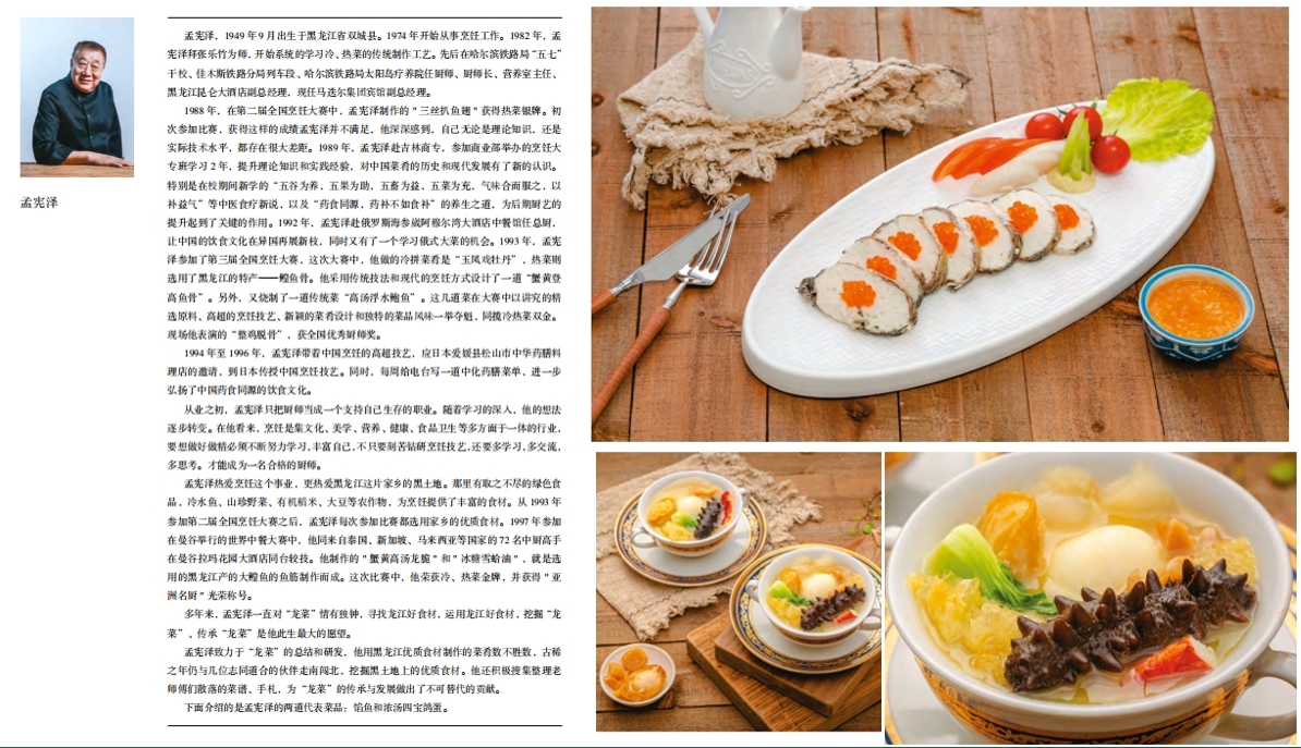 四代餐饮人,百年龙江菜。记录百年来,为“龙菜”的诞生、发展、传承、创新做出努力的几代匠人,搜罗还原了很多已经失传的“老菜”,并将“龙菜”四代传承中的精品菜品予以呈现。《龙菜传承精品集锦》不仅以纸质图书呈现,同样搭载视频等方式以数字化的方式传承发扬“龙菜”,也让更多的人品鉴到“龙菜”的美味与独特。