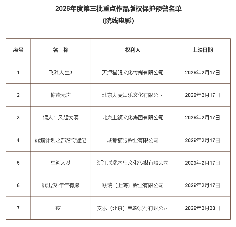 按照国家版权局《关于开展院线电影版权保护专项工作的通知》《关于进一步加强互联网传播作品版权监管工作的意见》及版权重点监管工作计划,根据相关权利人上报的作品授权情况,现公布2026年度第三批重点作品版权保护预警名单。