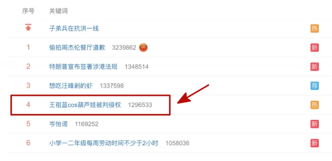 近日,“王祖蓝cos葫芦娃被判侵权 ”登上微博热搜。