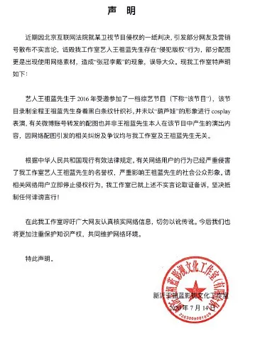 但王祖蓝工作室回应此事称:王祖蓝当时在该节目并未以“葫芦娃”的形象进行cosplay表演,因网络配图引发的相关纠纷和争议均与工作室及王祖蓝无关。
