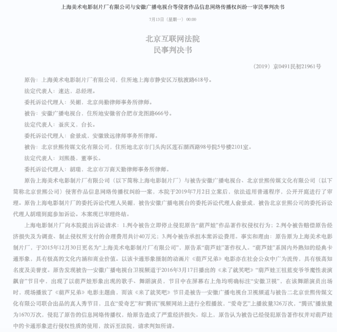 于是在2019年7月,上海美术电影制片厂(以下简称“上影厂”)起诉了被告安徽广播电视台,以及节目制作方北京世熙传媒文化有限公司(以下简称“世熙公司”)。
