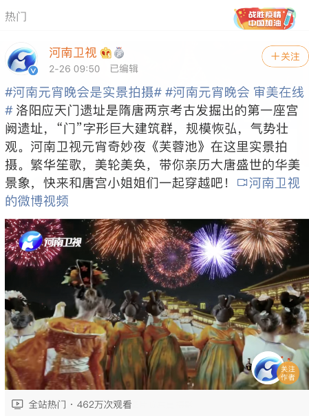 2月25日农历正月十四晚间,河南卫视又推出了元宵节特别节目——《河南博物院元宵奇妙夜》,在这档实景拍摄的节目中,《唐宫夜宴》节目中的唐宫小姐姐们带领观众们一起穿越,亲历大唐盛世的华美景象。节目播出后,再度掀起热浪。