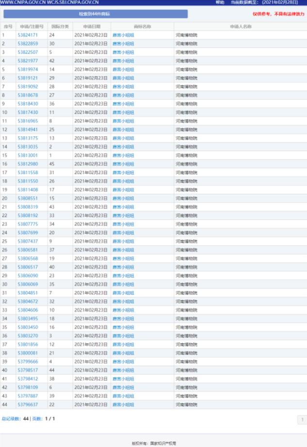 可以说,《唐宫夜宴》及节目中的唐宫小姐姐们实实在在地“火”了!记者登录中国商标网查询到,在节目“火”了之后,2月23日,河南博物院已在全部45个类别上就“唐宫夜宴”提交了商标注册申请(详情见下图1),在除第41类之外的其他44个类别上就“唐宫小姐姐”提交了商标注册申请(详情见下图2)。目前,中国商标网查询结果显示,这些商标均处于等待受理阶段。